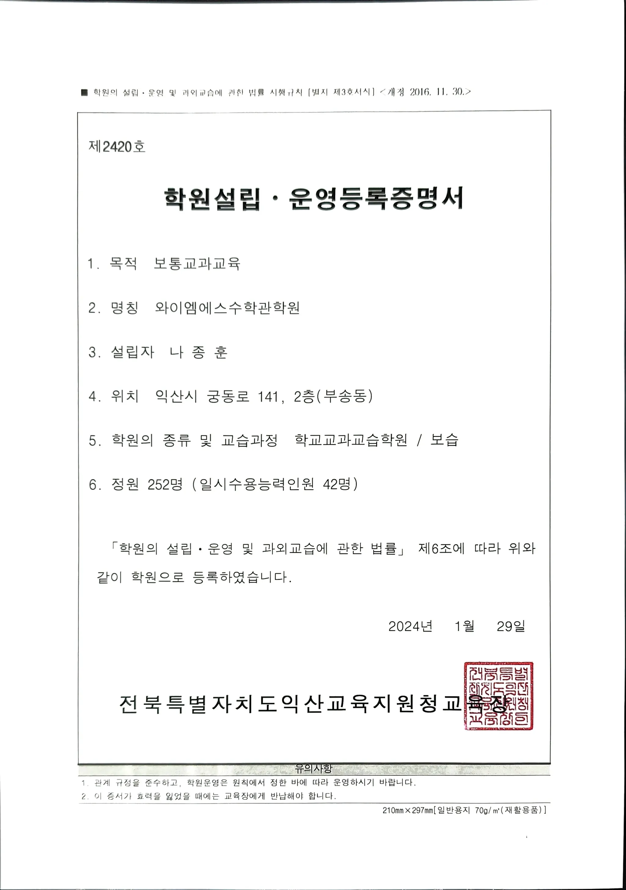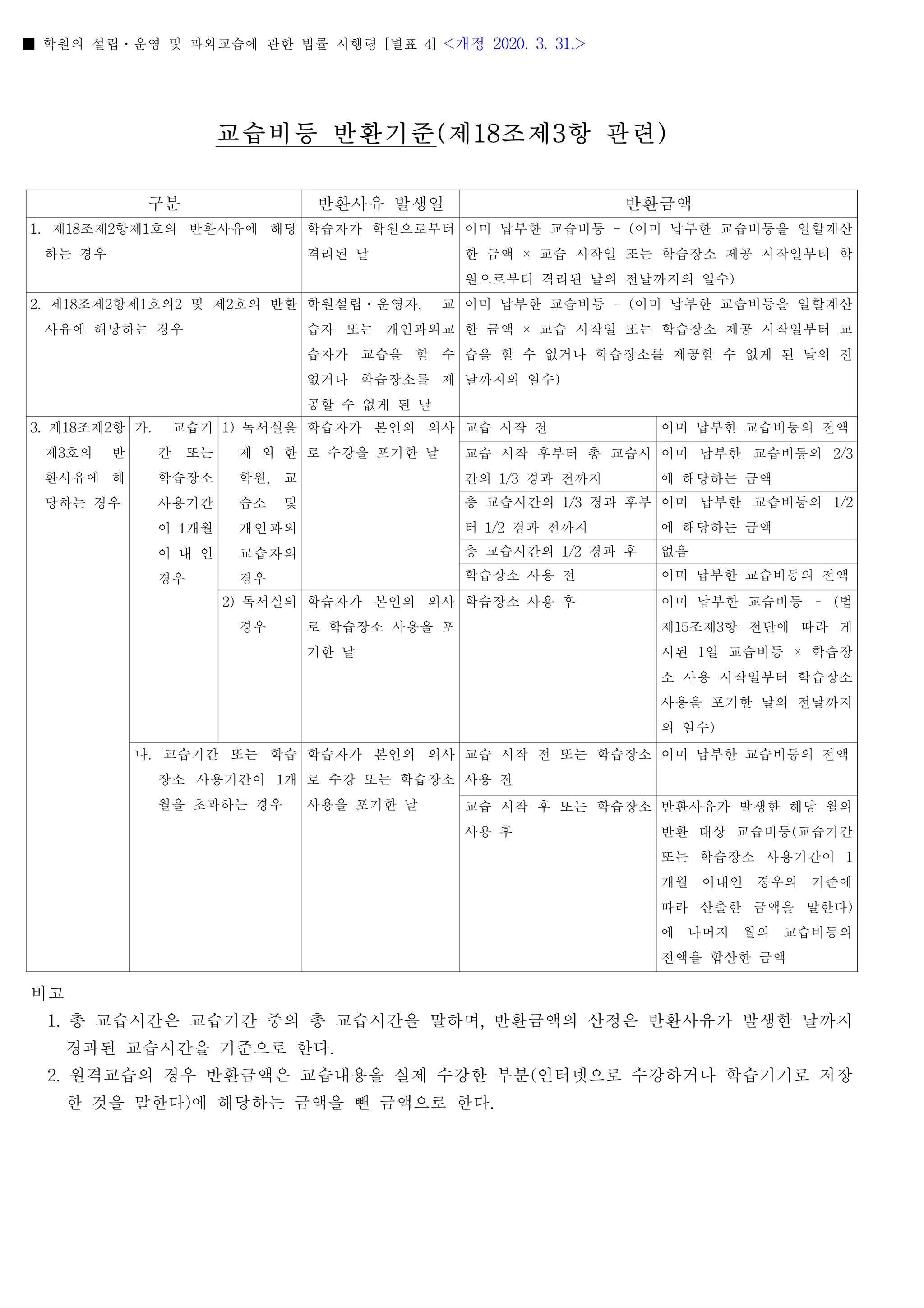 학원설립·운영등록증명서 / 교습비등 게시표 / 교습비등 반환기준 게시표